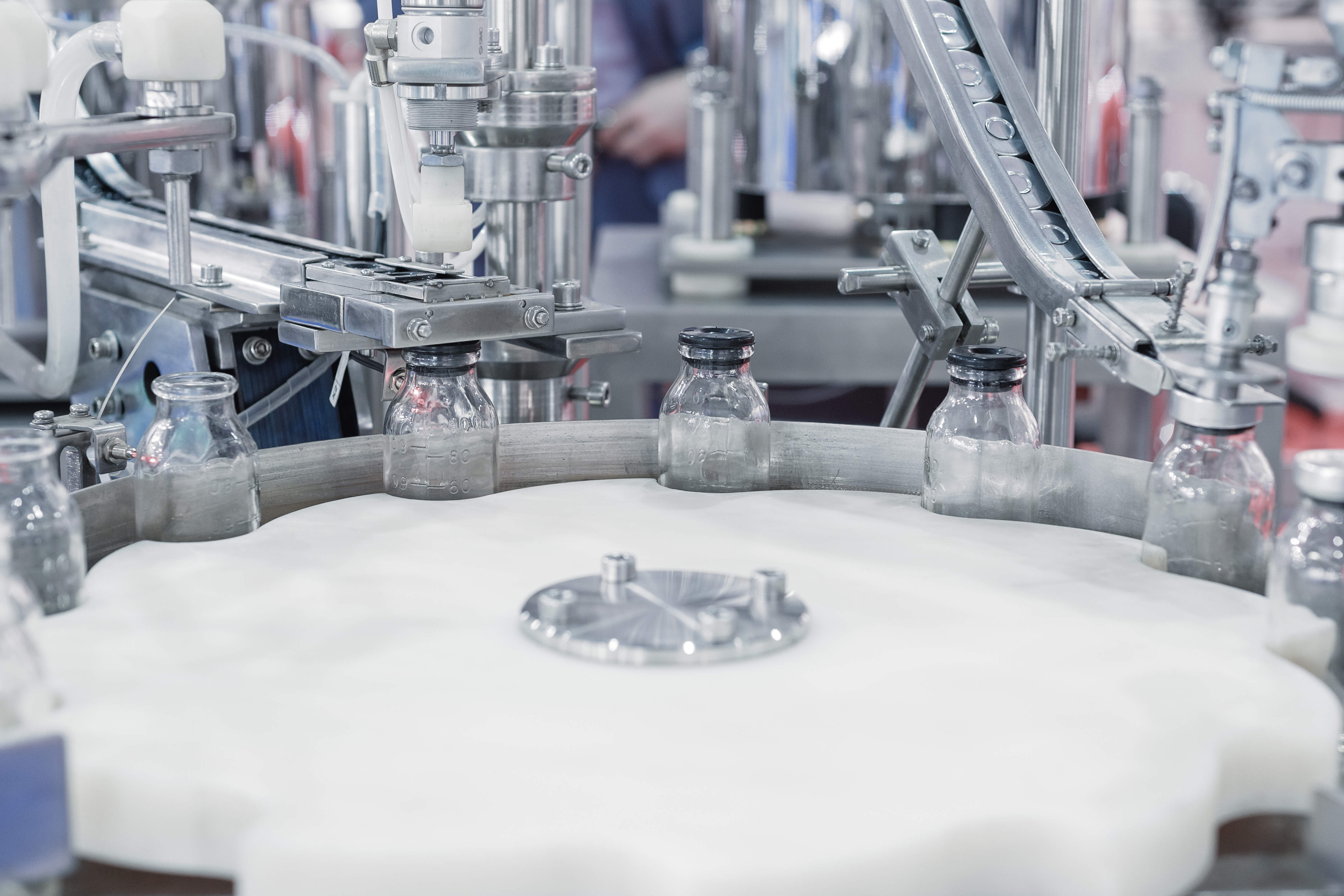 Αυτόματη Γεμιστική - Πωματιστική μηχανή δικής μας κατασκευής για την εμφιάλωση υγρών σε δοχεία με πώμα πιέσεως και τοποθέτηση ετικέτας.